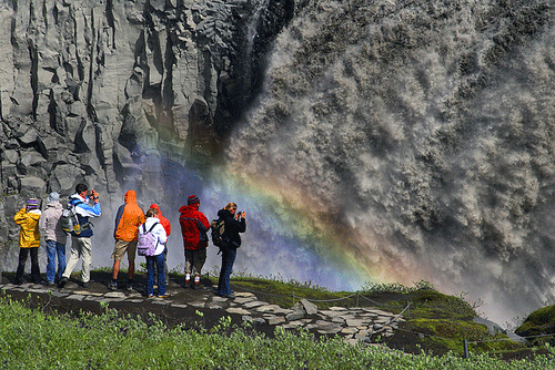 cliffs on both sides. From the west, the full face of the waterfall can be seen, and a short walk places you on top of the lava dam and fault line, that are responsible for the waterfall’s location. The waterfall is heard well before it is seen and the spray can be seen over ridges, before the edge of the canyon is reached. This isn't surprising. Dettifoss is Europe's greatest waterfall - at least in terms of volume, which averages 500 cubic meters of water per second during normal river conditions. Its volume often increases, though, especially when the weather or volcanic activity, prompts glacial melting on (or under) the Vatnajokull glacier icecap. The river water is almost always dark with sediment, in contrast with the white rapids and spray. During floods the river and the falls are often virtually black with sediment and debris. As with other Icelandic waterfalls, Dettifoss is approached at your own risk. There are no safety barriers, although one or two paths have been roped off in order to control erosion damage caused by visitors. If you’re going near the waterfall, you’ll almost certainly need some sort of rain gear - the heavy spray that rains down on the surrounding area can quickly soak you. You’ll also need to restrain any impulses you may feel to jump into the falls. Standing close to all the roaring water can be hypnotic, and a ride over the edge probably isn’t survivable. |